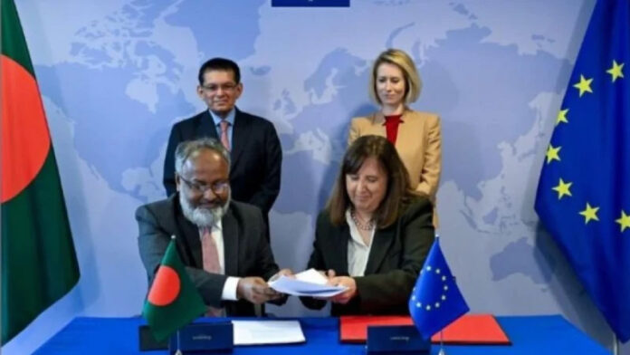 সোমবার (২০ এপ্রিল) ইইউর সদর দপ্তরে বাংলাদেশের পক্ষে সচিব (পূর্ব ও পশ্চিম) ড. মু. নজরুল ইসলাম এবং ইইউ’র পক্ষে ডেপুটি ম্যানেজিং ডিরেক্টর (এশিয়া অ্যান্ড প্যাসিফিক) পাওলা পাম্পালনি চুক্তিতে স্বাক্ষর করেন।
