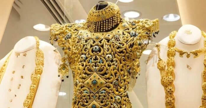 বিশ্বের সবচেয়ে ভারী সোনার পোশাক সকলের সামনে এনে ফ্যাশনের জগতে ইতিহাস সৃষ্টি করেছে দুবাই। এই পোশাকটির ছবি সদ্য ভাইরাল হয়েছে সোশ্যাল মিডিয়ায়। জানা গিয়েছে, ২৪ ক্যারেটের খাঁটি সোনা দিয়ে তৈরি এই পোশাকটির ওজন ১০.৫ কিলো।