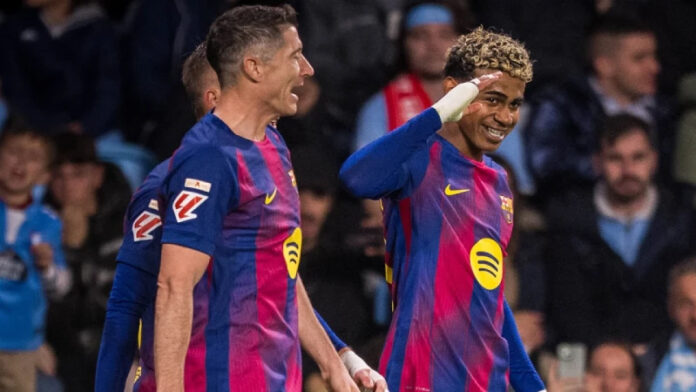৩৭তম মিনিটে চমৎকার ফিনিশিংয়ে দলকে আবার এগিয়ে নেন লেভানদোভস্কি। বাঁ দিক থেকে র‌্যাশফোর্ডের ক্রসে ছয় গজ বক্সে ভলিতে বল জালে পাঠান ৩৭ বছর বয়সী স্ট্রাইকার। এর পরপরই সমতা ফেরান ইগলেসিয়াস। প্রথমার্ধের যোগ করা সময়ের চতুর্থ মিনিটে তৃতীয় দফায় এগিয়ে যায় বার্সেলোনা। এবার গোল দেন ইয়ামাল।