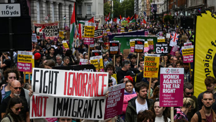 অনলাইন ডেস্ক : লন্ডনের মধ্যাঞ্চলে এক লাখেরও বেশি মানুষ অভিবাসনবিরোধী বিক্ষোভ মিছিল করেছেন। শনিবার (১৩ সেপ্টেম্বর) অভিবাসনবিরোধী কর্মী টমি রবিনসন এই বিক্ষোভের আয়োজন করেন।