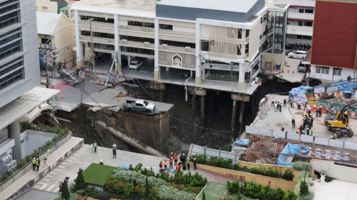 অনলাইন ডেস্ক : থাইল্যান্ডের রাজধানী ব্যাংককে হঠাৎ করে সড়কের মাটি ধসে এক বিশাল সিঙ্কহোলের সৃষ্টি হয়েছে। এই সিঙ্কহোলে তিনটি যানবাহন তলিয়ে গেছে। এতে আশপাশের হাসপাতাল ও স্থানীয় বাসিন্দাদের সরিয়ে নেওয়া হয়েছে। তবে এ ঘটনায় কেউ হতাহত হননি।